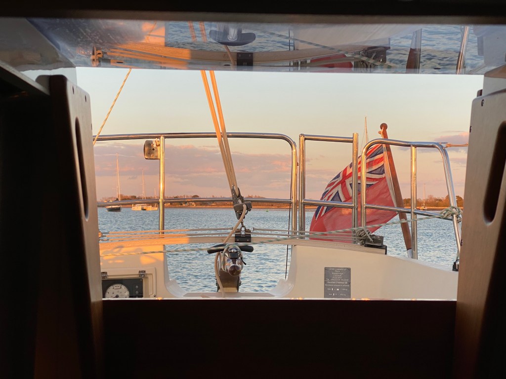 We drove down from the midlands amid bucketing rain and strong winds; it took faith in the forecast to believe we would be sailing the next day as we sat in the saloon hearing the rain hammering on the coach roof. Still, the steak and red wine helped take our minds off the weather.