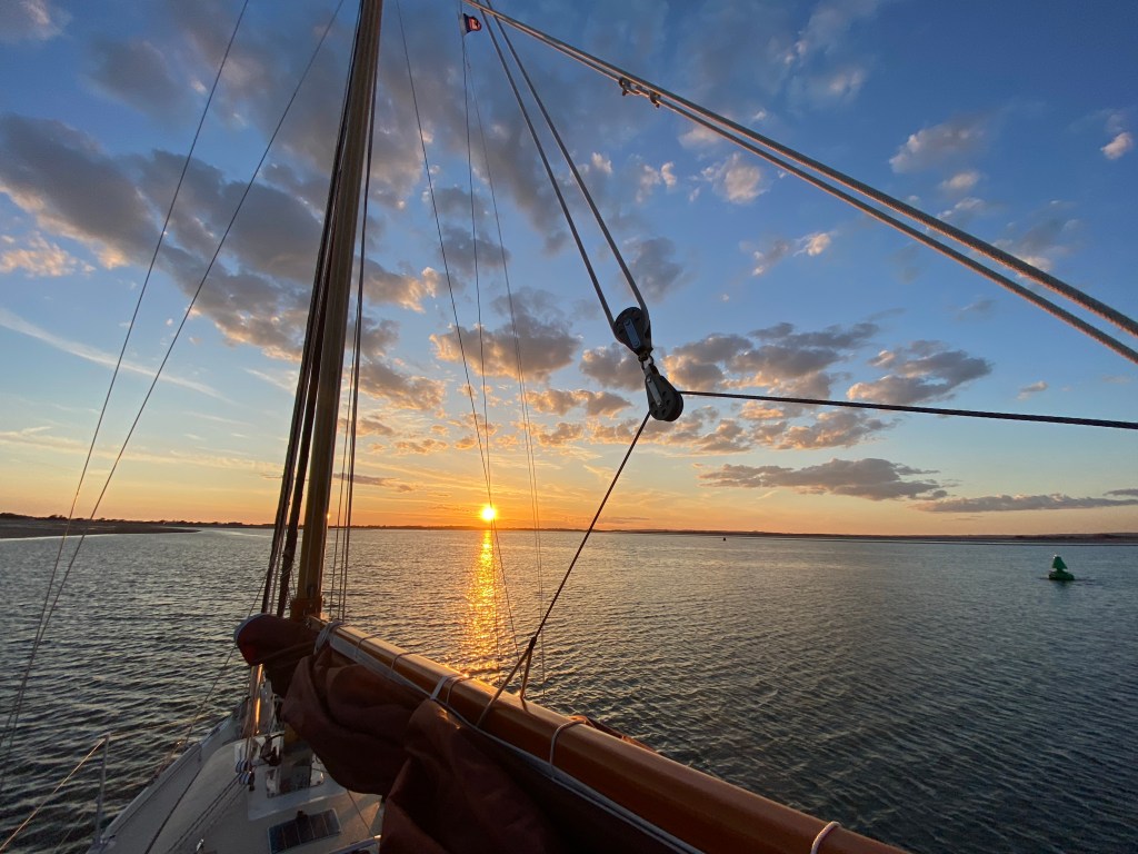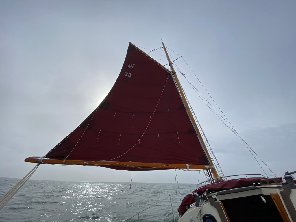 We completed the trip in a series of beats along the flood tide, with the westering golden sun, in the company of Golden Vanity, a 38ft Gaff Cutter, built in 1908 as a yacht for the maritime artist Arthur Briscoe.