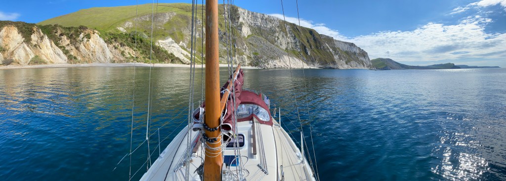 Wednesday dawned bright and fair. Ben and I had a leisurely breakfast whilst admiring our beautiful anchorage. The anchor alarm showed that we had held firm through the night, which increased my confidence in the holding ability Mr. Spock, our Vulcan anchor, as we had had strong gusts during the night. I wanted to fly my drone, but sadly the anchorage fell within the scope of Lulworth firing range, which prevented takeoff.