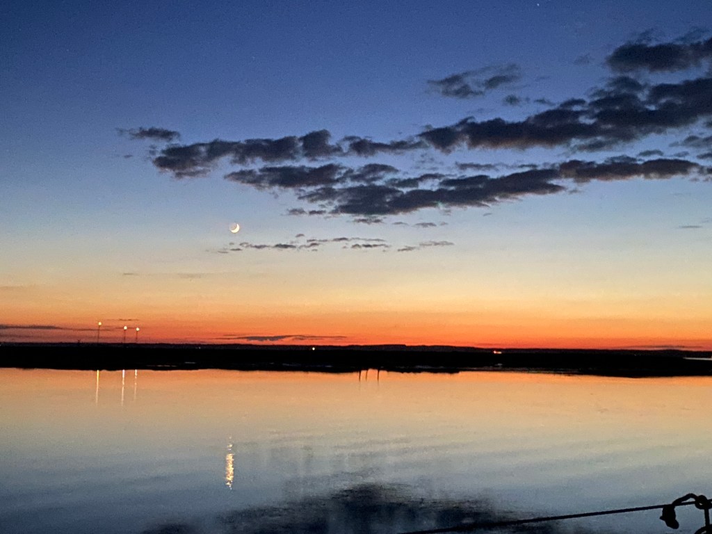 As the sun set, the wind faded and we were treated to a most beautiful sunset and rise of the young crescent moon, to the soundtrack of the calls of oystercatchers, geese and terns.