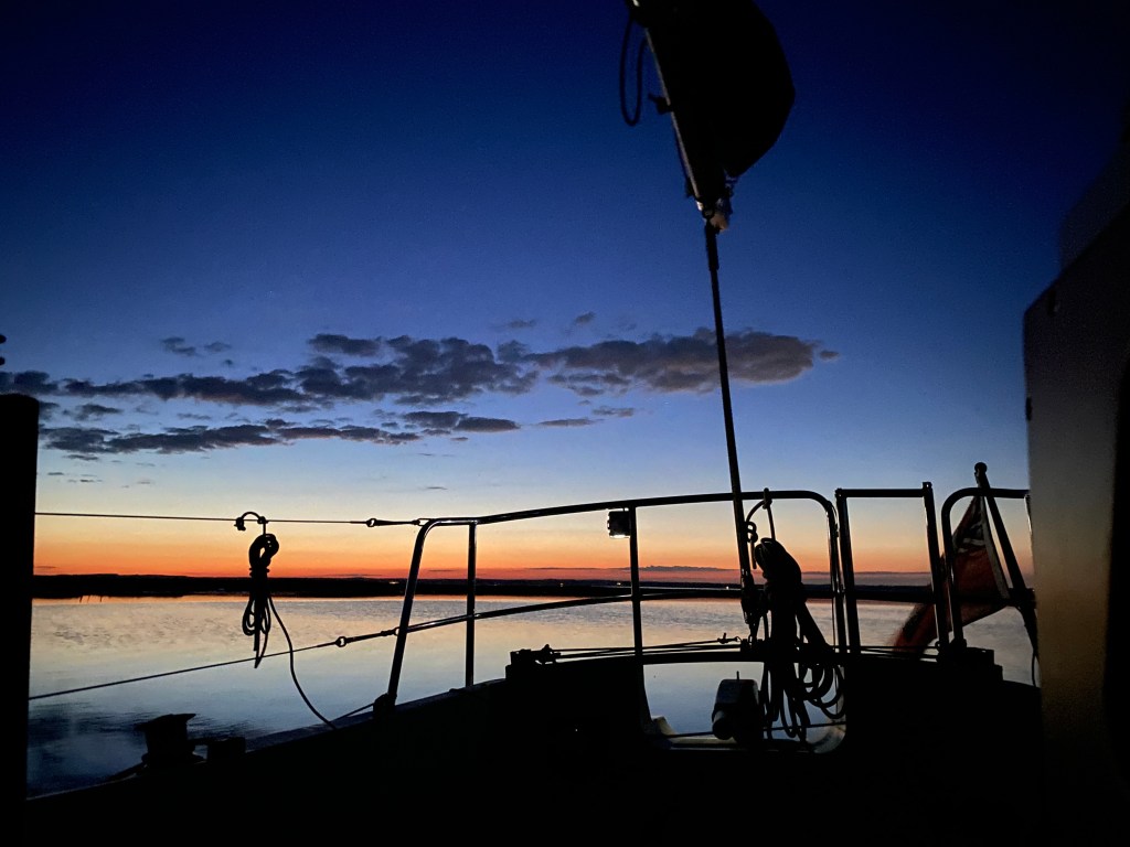Having cleared the shipping lanes, there was far less traffic and the wind was on our nose. At dusk I put the main down and we motored on in the dark. This part was mostly rather dull, as there was nothing to see in the dark. The only excitement was an encounter with a fishing vessel which was behaving as if he could not see us and seemed to be permanently heading us off with his course changes.