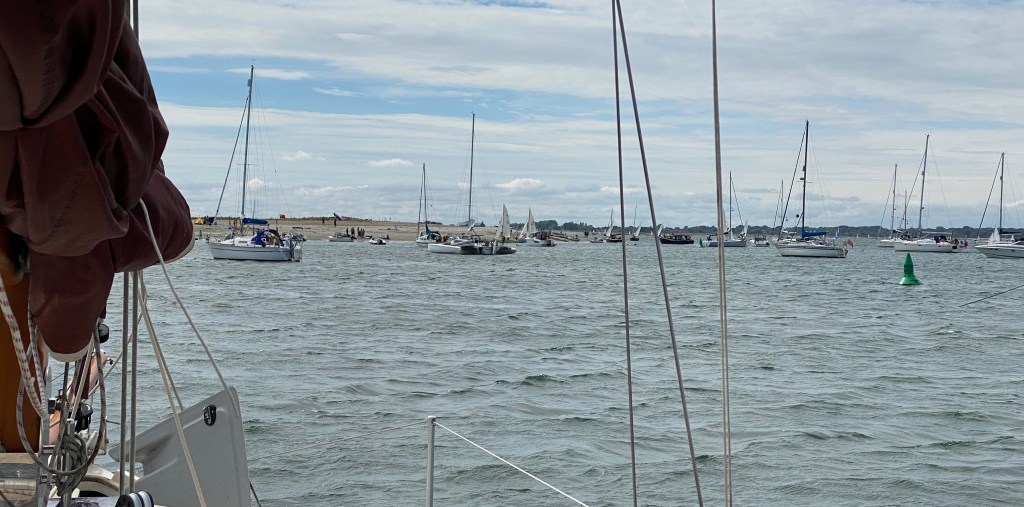 Once we were clear of the Isle of Wight ferry and hovercraft tracks, we turned to port and made for the boat passage through the old submarine barrier that stretches south from the shore near Southsea pier out to Horse Sand Fort a mile and a half offshore. From there, it was a spirited run east, past Winner sand at the entrance to Langstone Harbour and on to Chichester. In no time at all, we reached West Pole, marking the southerly extreme of the channel into Chichester harbour, and gybed round to reach up the channel. On previous occasions when I’ve followed this track, I have been in Aurora (our previous boat, a cape cutter 19) and not worried about depth. This time, though on a neap tide, it was nearly low water, and I paid close attention to the depth as we crossed the bar. With the sea flat, there was plenty of water and we soon slipped past Hayling Island sailing club and turned to starboard towards the popular anchorage at East Head. As expected on a sunny Weekend afternoon, the spot was thick with boats at anchor, among which weaved a multitude of sailing dinghies.