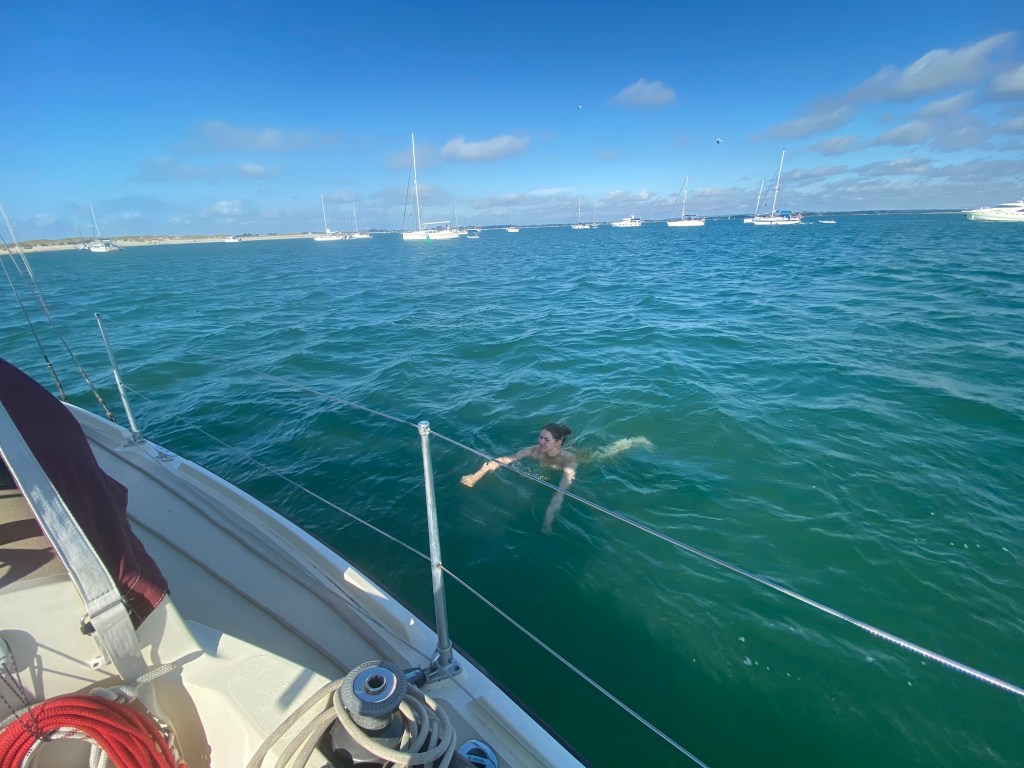 We awoke to another fine morning with a steady SSW breeze. It was due to veer towards SW, so I was keen to set off and avoid beating if possible. We left in good time, but not before Alice had a refreshing swim.