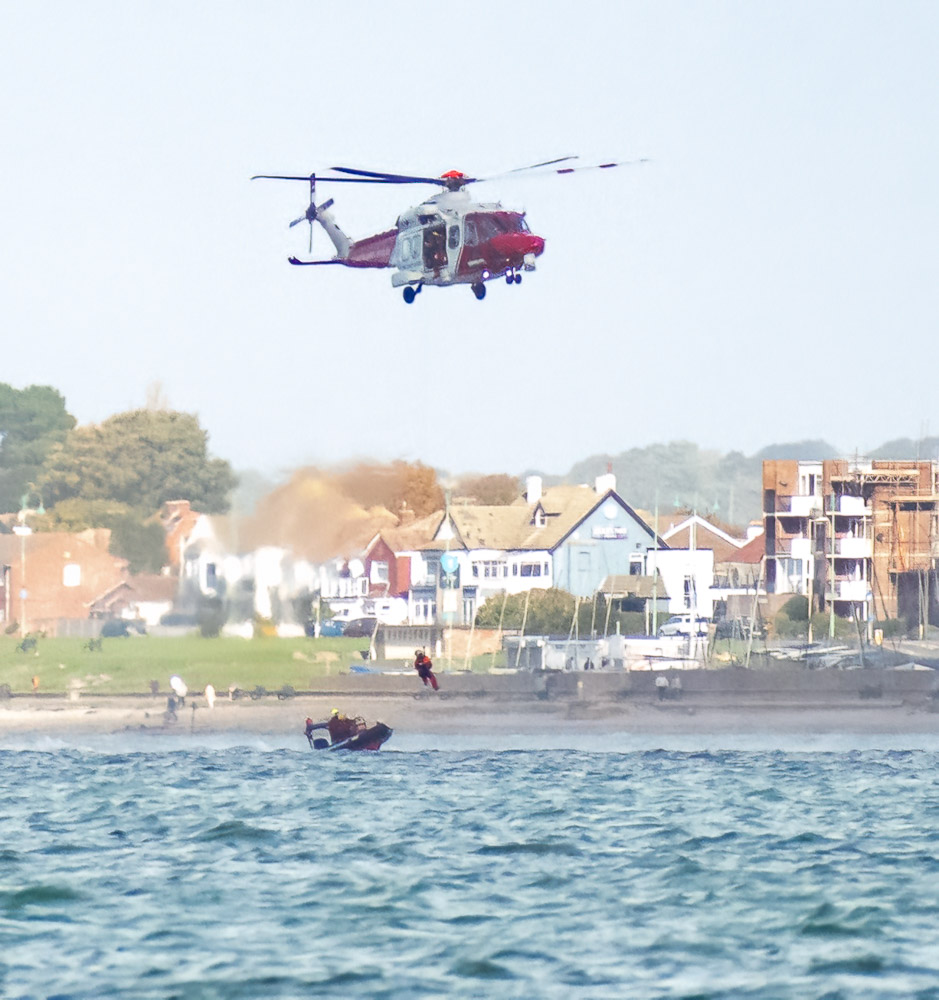 The coastguard helicopter lowers a wire to the inshore lifeboat.