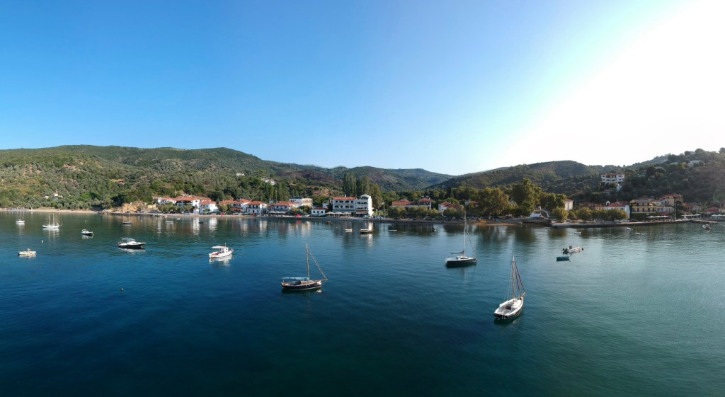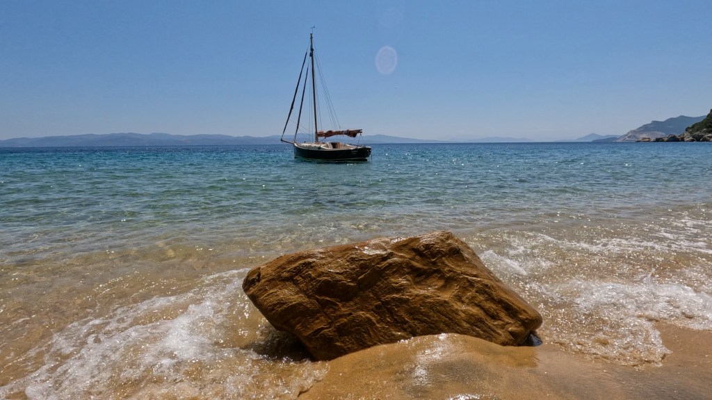 After a very agreeable meze lunch, Chris and I left the ladies to relax on the beach and ventured out again in Kaliope to meet the tourist boat’s return from Skiathos. Just two-up, a double reef and Yankee was perfect and Kaliope cut enthusiastically through the sea towards the returning day tripper boats. A few beats to windward and a wonderful run back to harbour completed the day and we were ashore a few minutes after the girls.