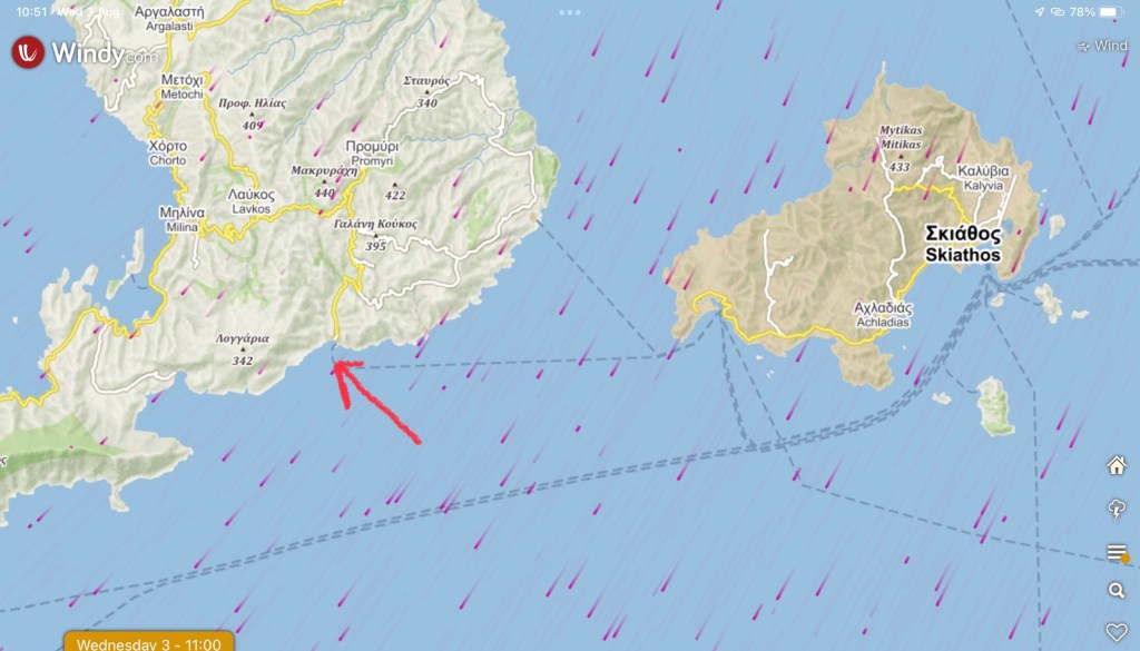 One example of this is the day we nearly went to Skiathos, the town on the nearest of the Sporades Islands. Aimee and Alice had taken the tourist ferry across for some shopping and we decided to follow them in Kaliope. The valley wind had been strong overnight, but by mid-morning was very light. Out in the main channel, we could see rough water, so put in a reef. The light valley wind allowed us to waft North along the shore up towards the point and avoid a long beat. It was clear there was quite a bit of wind outside the lee of the headland, so Chris quickly put in a second reef, just before we left this relative shelter. This was just as well, because even four-up, we would have been over powered otherwise. The wind direction was just right for Skiathos and Kaliope powered across the straights a point or two off close-hauled. The wind was well above the forecast 15-20kt and decision was quickly made to abort and run back under the shelter of the headland. It was just as well, because the wind sustained that force for the rest of the afternoon and would have made the rest of the crossing, as well as the return, quite an uncomfortable experience.