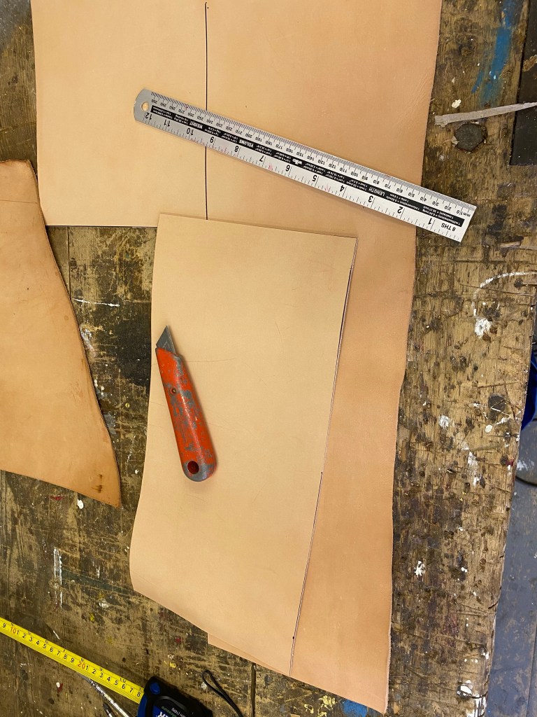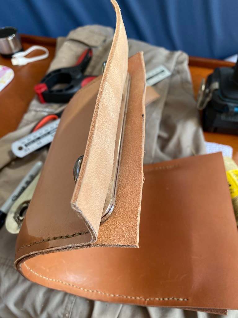 The condition of the gaff saddle when I started; you can see the damage to the original lining which I think was the cause of my mast wear. I used a paint stripper to warm the plastic and soften the adhesive – this made removing the material much easier, but I was careful to minimise heating of the metal. The leather was supplied in large rough cut pieces. After very careful measurements, I cut a piece which was the correct height (allowing for a 5mm seam top and bottom) but over-long, because I was not sure how much length I needed as the leather was stitched around the curve. The trickiest part was making cut-outs for the various fittings on the back of the saddle. Despite my careful measurements, I did make one mistake (one of the large slots was too big). Measure twice (or more!), cut once… Fortunately this error does not show when the saddle is fitted. You can see I drew an outline of the metal and then added the seam allowance. Trial fitting of the outer section. The inner piece was very easy to cut. I measured along the leather with my trusty Portland dividers, and marked with a sharpie where the holes should be, so the stitching would look even. Before fitting, I wetted the leather, to make it more supple. I held the sandwich in place with small clamps and then drilled holes. I made the holes in small batches, so that the position would be right, as the leather conformed to the curve of the saddle. Saddle stitch is a very easy stitch, using two needles cross-crossing each other. Very satisfying work!Top and bottom now stitched. The leather is ready for trimming to size at the ends.The ends now trimmed to size. I let the leather dry and then cut with a good pair of scissors. Note the holes drilled in measured positions, ready for stitching. The finished work! Overall I’m really happy with the result – looks great and, a few months later, much less wear on my mast.