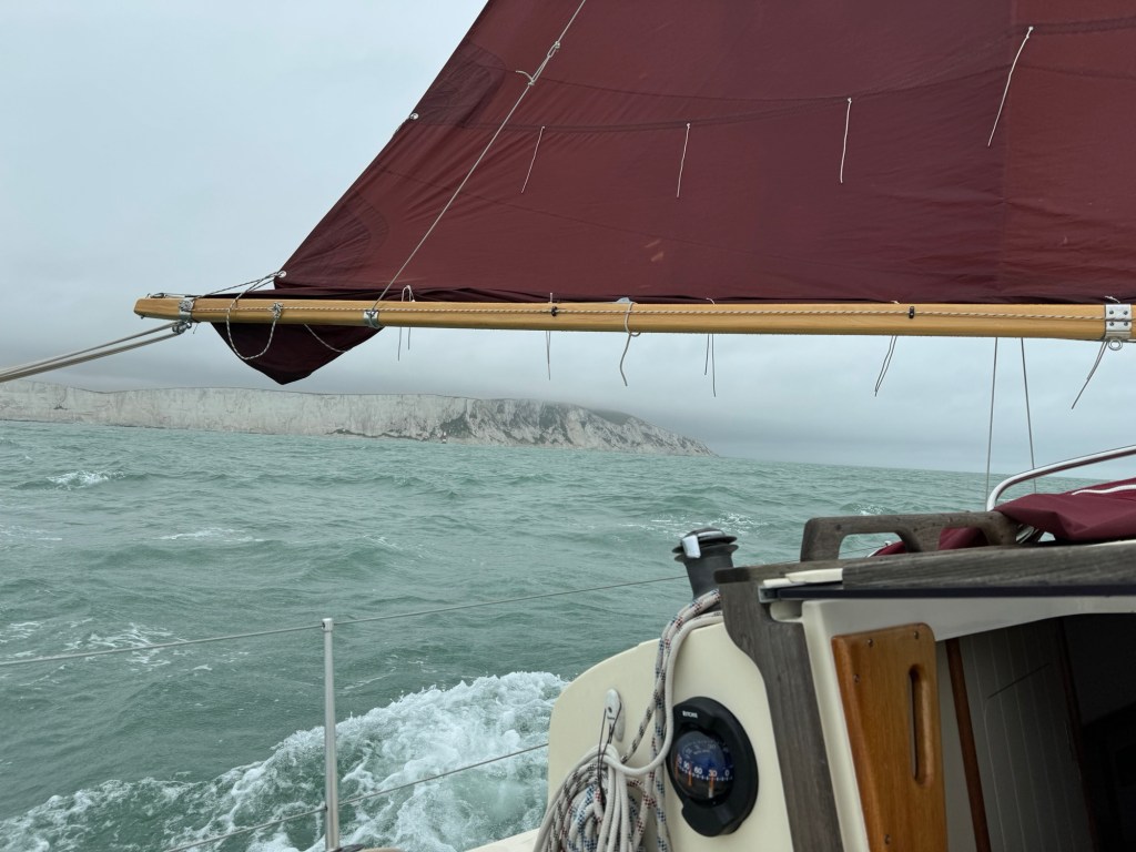 The next morning was forecast for northeasterlies, increasing in strength and swinging to SW. I left early, but not early enough. The promised SE wind was light and variable and not long before Dungeness head, I noticed a yacht ahead of me on a parallel course bear away to the south, close hauled. Sure enough, a few minutes later, I experienced the same 90-degree wind shift. I decided to drop sails and motor into the wind, the other boat beat on. I took an offshore route past Dungeness, to maximise the tidal lift but progress gradually slowed across Rye bay. The wind increased to about F6 and though Molly bravely plugged into the short steep seas this created, her speed was rather curtailed. I watched as the boat I had seen earlier crossed and recrossed my path, evidently with much better boat speed than me.