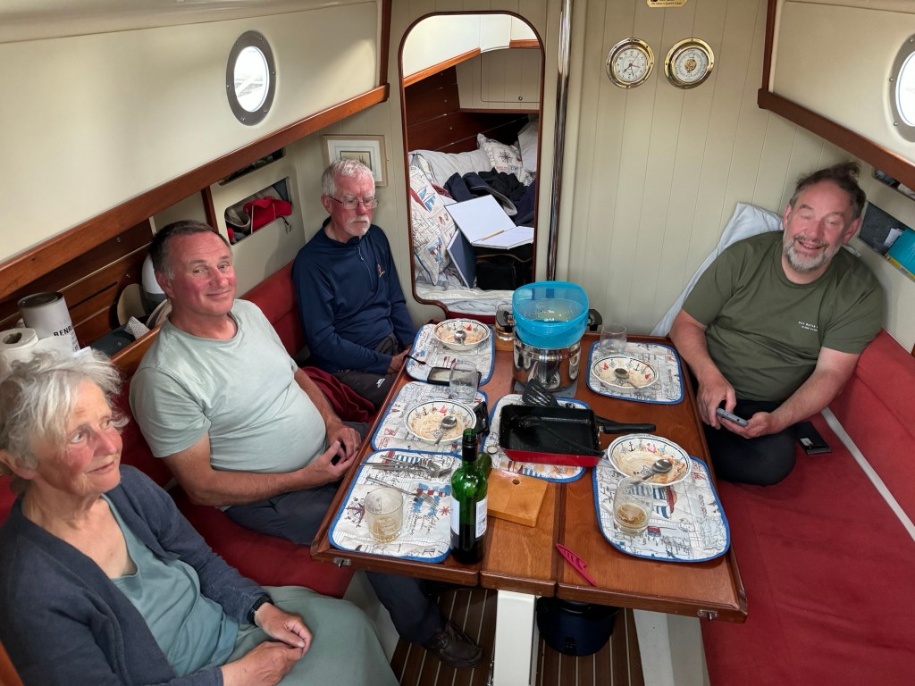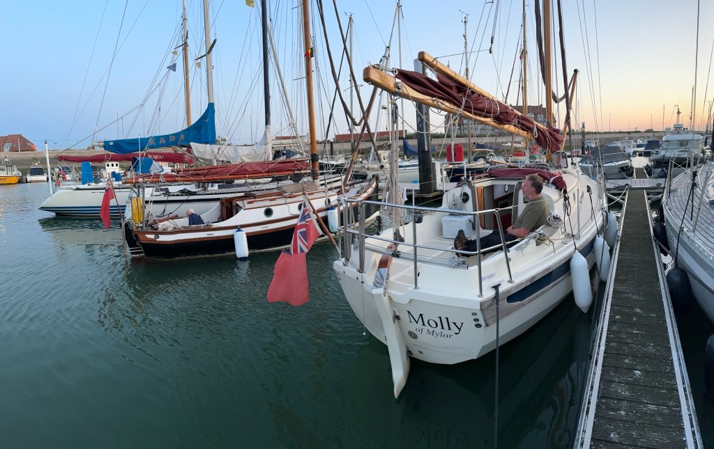The five crews rather tired crews of Molly, Indian Runner, East Breeze, Moon River and Plum met to eat a meal together, in celebration of Chris’ birthday and our last evening as a group. Following this, Plum and East Breeze were heading for the east coast, via Ramsgate, whereas the rest of us were to cross to Dover for points west.