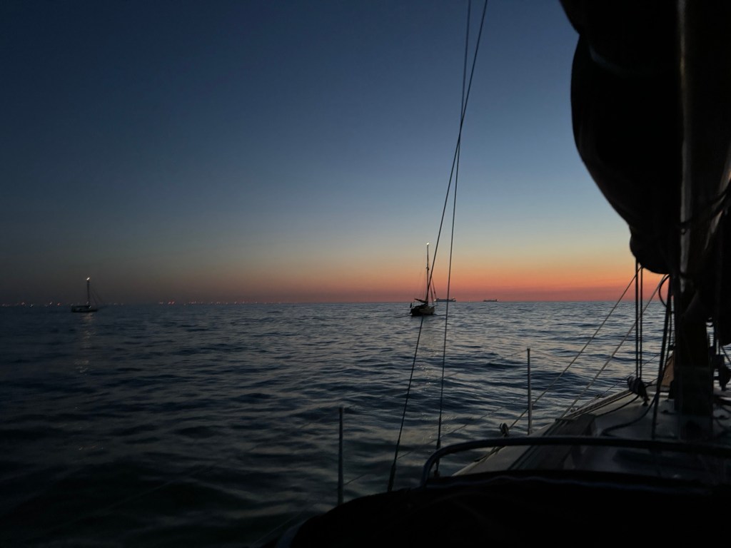 We made a 4.30am start from Blankenburg, leaving the port in the darkness with the bright lights of Zeebrugge port ahead. It was a very calm morning and we motored down tied with just the staysail to stabilise us. Despite being a neap tide, the current was very strong and we were making over 6kt as Zeeland hove into view. We had to wait for a large container ship to pass before turning across the Westerschelde to enter Vlissingen. There were a number of other boats waiting for the ship lock into the canal, as apparently there had been a problem with the lock. We passed through a few minutes after the time for the “blue wave”, where a convoy of boats passes through the bridges opening in sequence.
