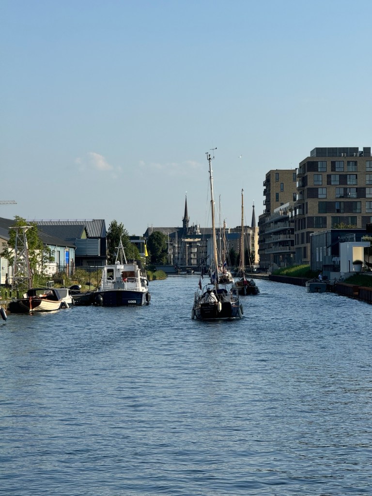 We threaded our way under sail – our course always seemed to be a beat, despite the twists and turns of the channel. Every time we thought we could sail straight to the next mark, the wind would shift to head us off! After an hour or two of short tacking back and forth in the narrow channel, we gave up and motored, as we’d been warned not to turn up late to our destination that night, Goes (pronounced like a Scot might refer to his home: “hoose”).