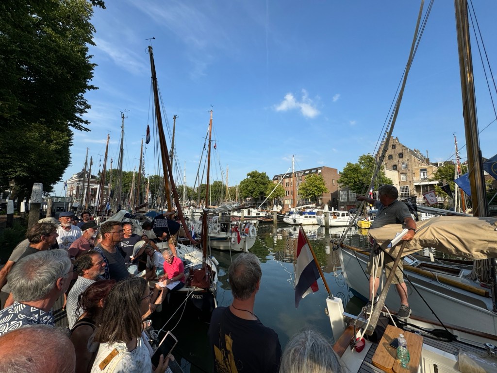Drinks aboard East BreezePicturesque DordrechtHistoric boats in the harbourThe palaver on the pontoon (briefing for the next day)Stardust, Molly and Indian Runner