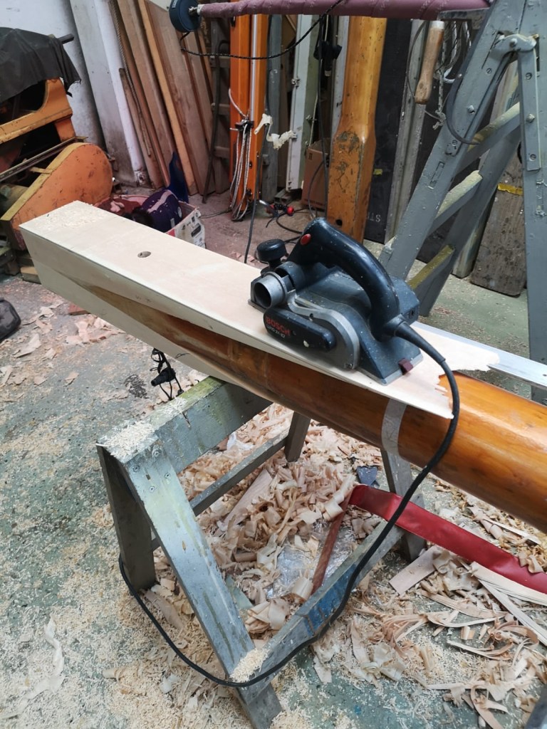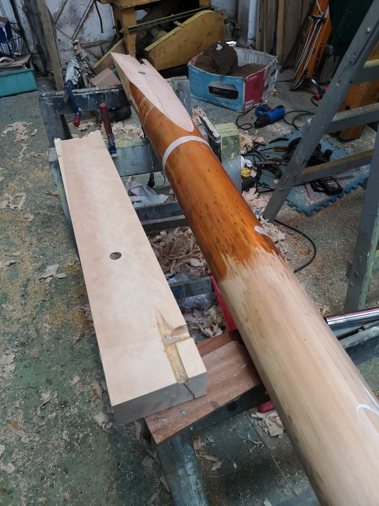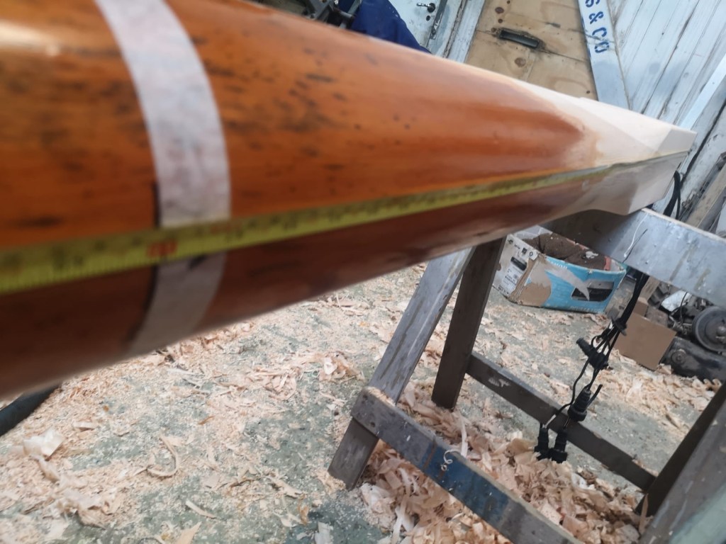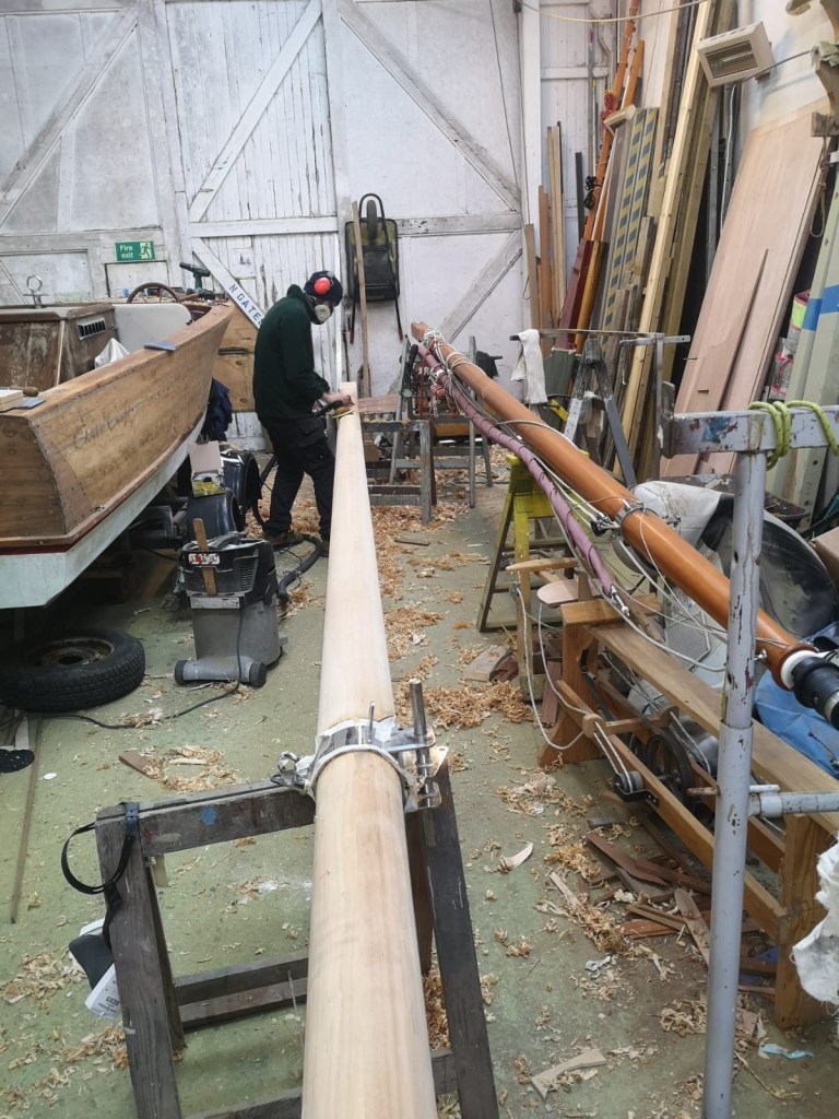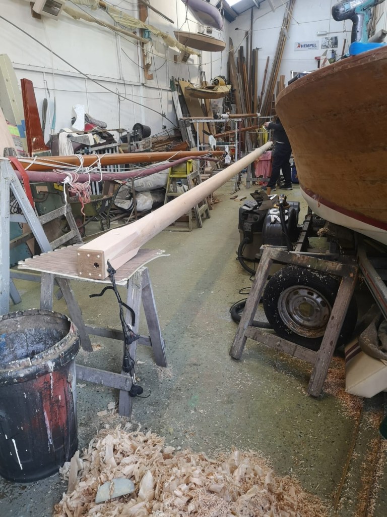 When Molly came ashore for the winter, I wanted to protect the mast from the worst of the weather. Withe the mast lowered, I was able to make wooden cruitches to support the top end, either side of the spreaders; the lower end sat comfortably through the tabernacle. Meanwhile Niki made a waterproof fabric cover for the mast which will keep wind and rain off not just the varnish, but also accommodates the jib on its carbon fibre furler and also the running rigging.