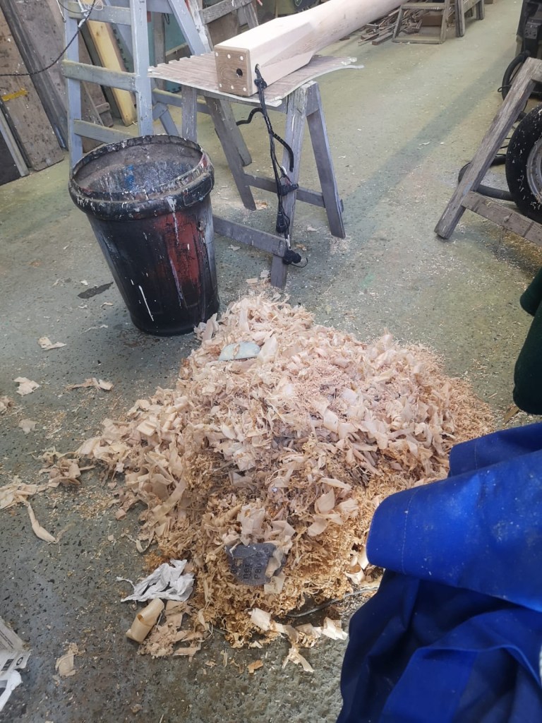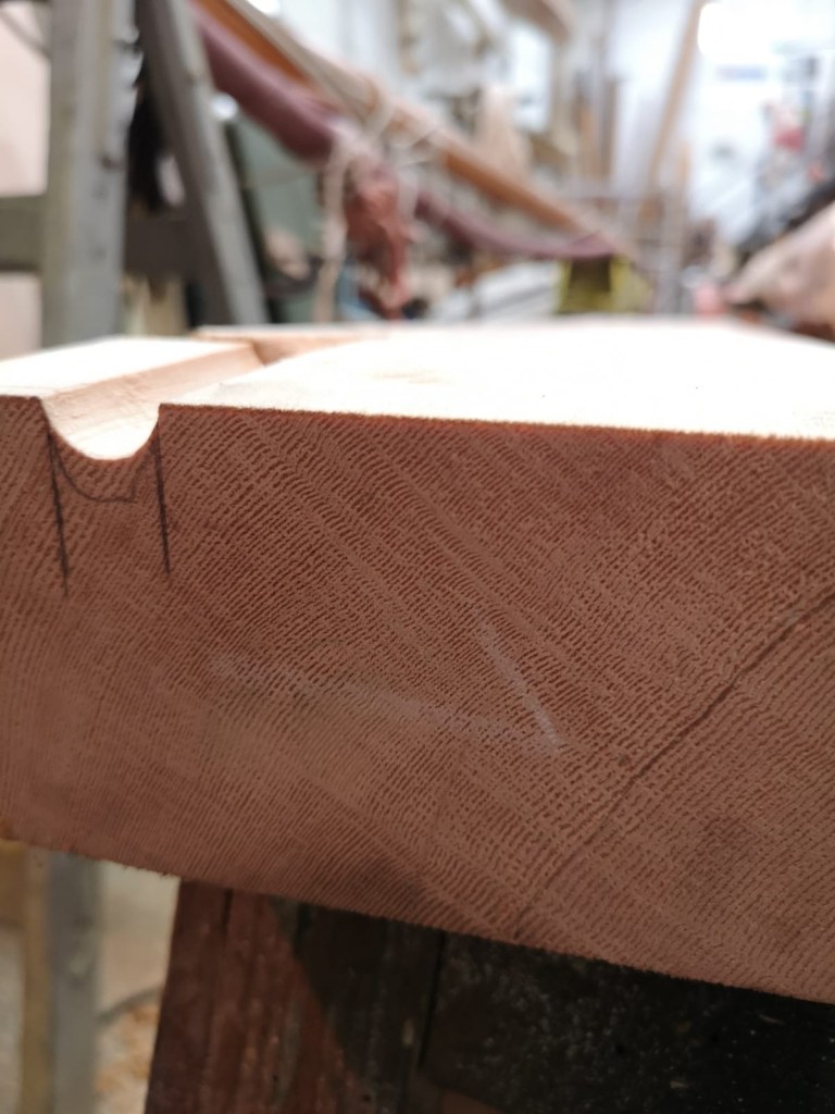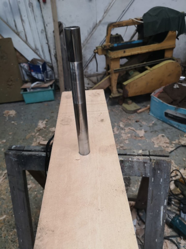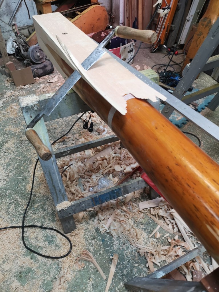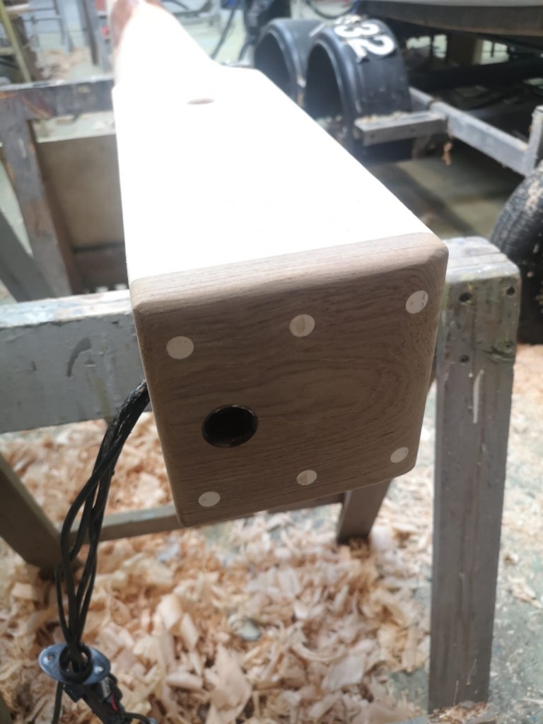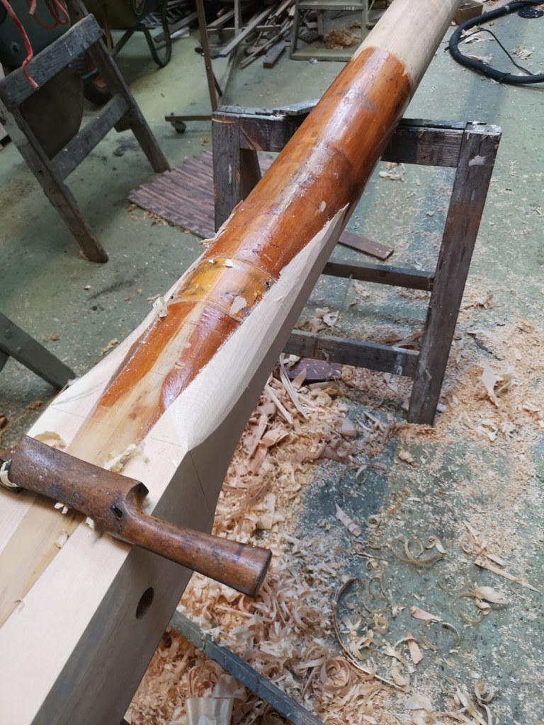 When Molly came ashore for the winter, I wanted to protect the mast from the worst of the weather. Withe the mast lowered, I was able to make wooden cruitches to support the top end, either side of the spreaders; the lower end sat comfortably through the tabernacle. Meanwhile Niki made a waterproof fabric cover for the mast which will keep wind and rain off not just the varnish, but also accommodates the jib on its carbon fibre furler and also the running rigging.
